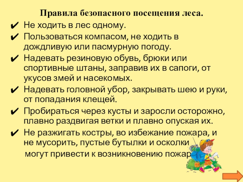 Соблюдать правила техники безопасности при прогулках в лесу, на реке: запрещается разжигать костры на территории лесного массива; купаться только в отведённых специально для этого местах и в теплое время; не употреблять в пищу незнакомые грибы и ягоды.