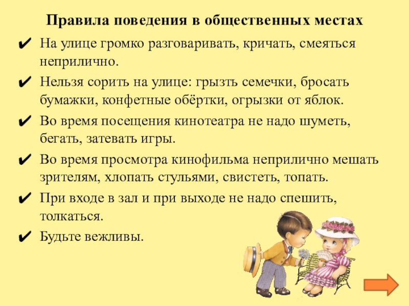 Нельзя сорить на улице: грызть семечки, бросать бумажки, конфетные обёртки, огрызки от яблок.