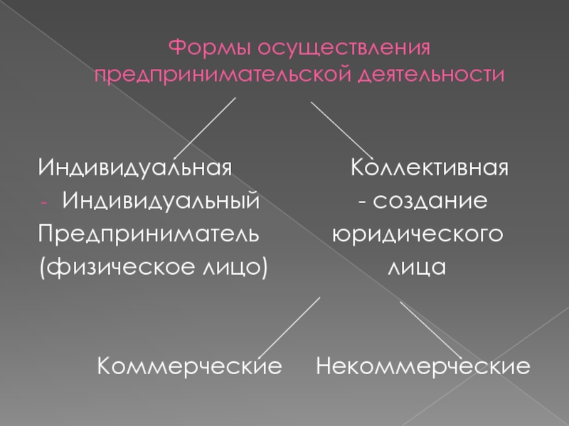 Формы осуществления предпринимательской деятельностиИндивидуальная         Коллективная Индивидуальный