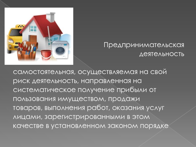 Предпринимательскаядеятельность самостоятельная, осуществляемая на свойриск деятельность, направленная насистематическое получение прибыли отпользования имуществом, продажи товаров, выполнения работ, оказания