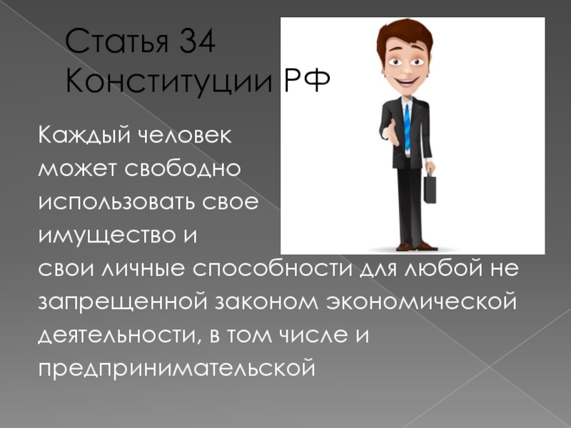 Статья 34 Конституции РФКаждый человек может свободно использовать своеимущество и свои личные способности для любой незапрещенной законом
