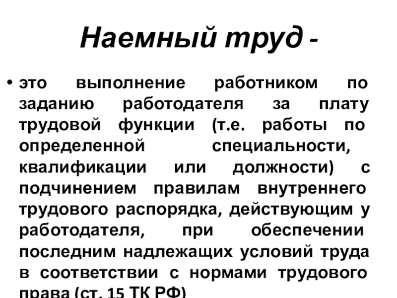 Наемный труд -это выполнение работником по заданию работодателя за плату трудовой функции (т.е. работы по определенной специальности,