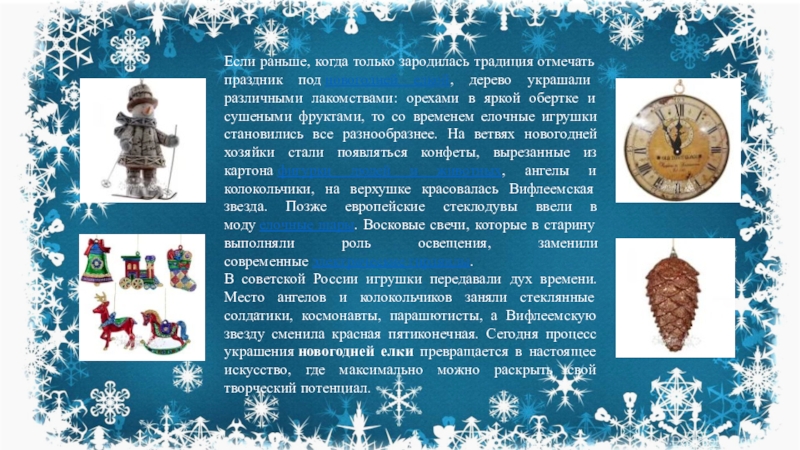 В советской России игрушки передавали дух времени. Место ангелов и колокольчиков заняли стеклянные солдатики, космонавты, парашютисты, а Вифлеемскую звезду сменила красная пятиконечная. Сегодня процесс украшения новогодней елки превращается в настоящее искусство, где максимально можно раскрыть свой творческий потенциал.