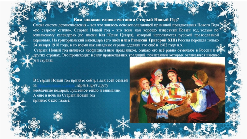 явилось основополагающей причиной празднования Нового Года «по старому стилю». Старый Новый год – это всем нам хорошо известный Новый год, только по юлианскому календарю (по имени Кая Юлия Цезаря), который используется русской православной церковью. На григорианский календарь (его ввёл папа Римский Григорий XIII) Россия перешла только 24 января 1918 года, в то время как западные страны сделали это ещё в 1582 году н.э.