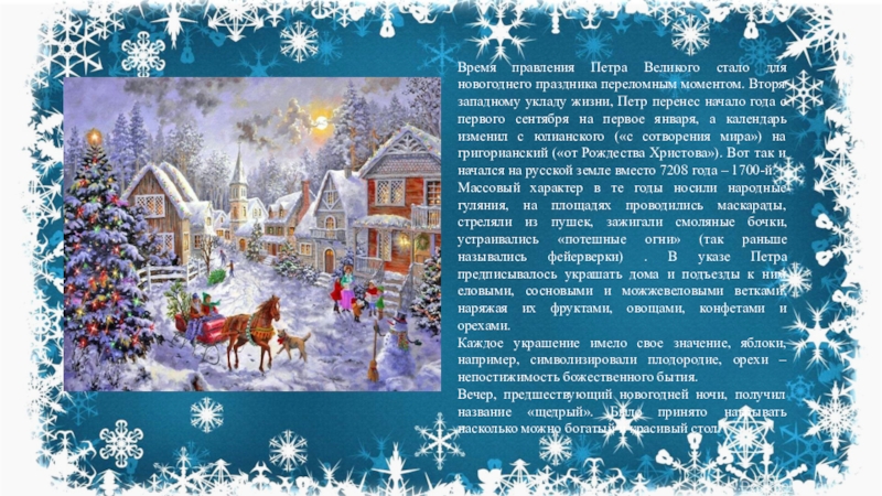Слайд 5Время правления Петра Великого стало для новогоднего праздника переломным моментом. Вторя