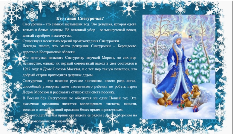 В России без Снегурочки не обходится ни один Новый год. Эта сказочная красавица является воплощением чистоты, юности, веселья и делает зимний праздник более ярким и радостным.