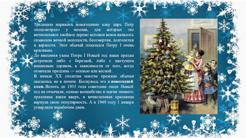 Слайд 6Традицию наряжать новогоднюю елку царь Петр «подсмотрел» у немцев, для которых