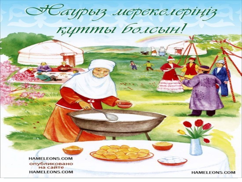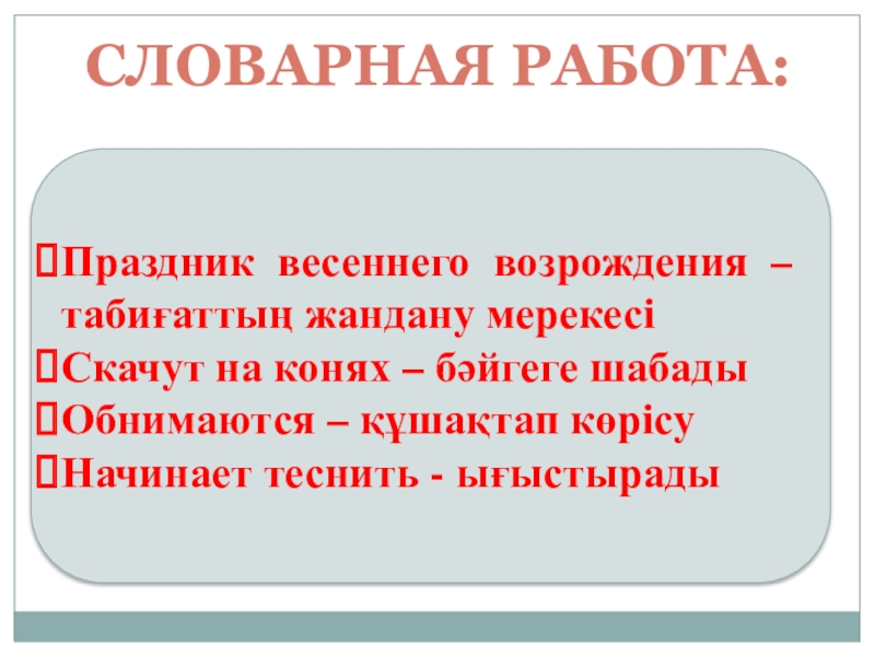 Словарная работа:Праздник весеннего возрождения – табиғаттың жандану мерекесіСкачут на конях – бәйгеге шабадыОбнимаются – құшақтап көрісуНачинает теснить