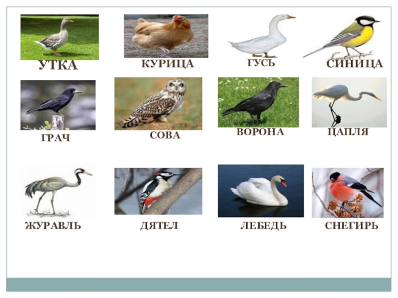 уткаКурицагусьсиницаграчсоваворонацапляжуравльдятеллебедьснегирь