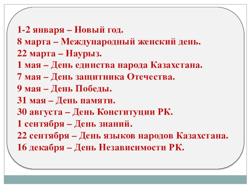 1-2 января – Новый год.8 марта – Международный женский день.22 марта – Наурыз.1 мая – День единства