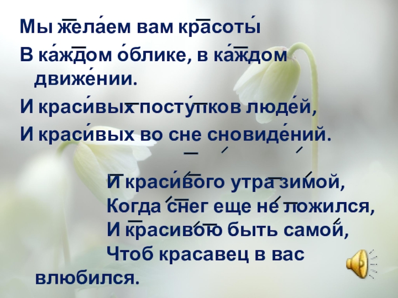 Мы жела́ем вам красоты́В ка́ждом о́блике, в ка́ждом движе́нии. И краси́вых посту́пков люде́й,И краси́вых во сне сновиде́ний.