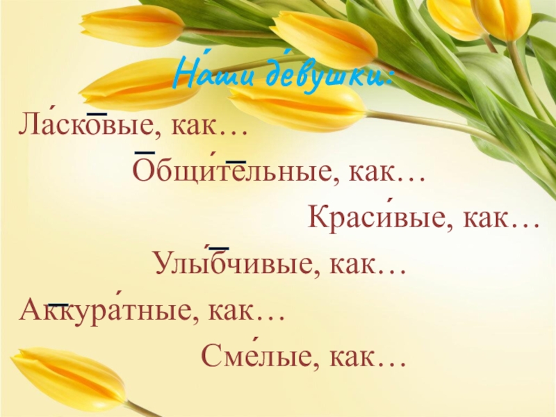 На́ши де́вушки:Ла́сковые, как…Общи́тельные, как…Краси́вые, как…Улы́бчивые, как…Аккура́тные, как…