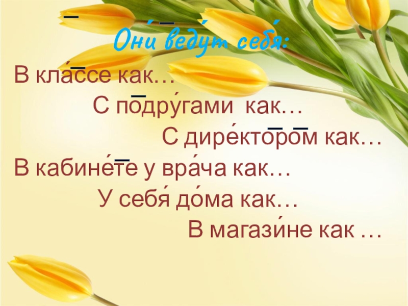 Они́ веду́т себя́:В кла́ссе как…С подру́гами как…С дире́ктором как…В кабине́те у вра́ча как…У себя́ до́ма как…В магази́не