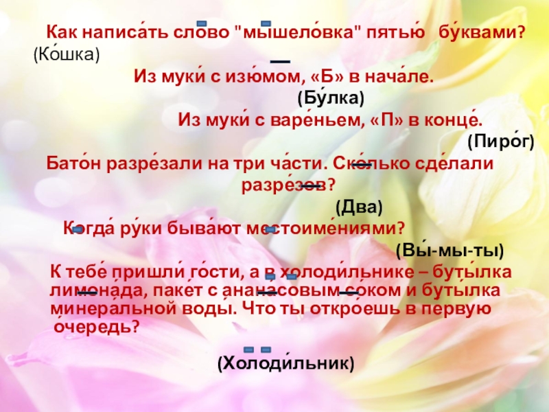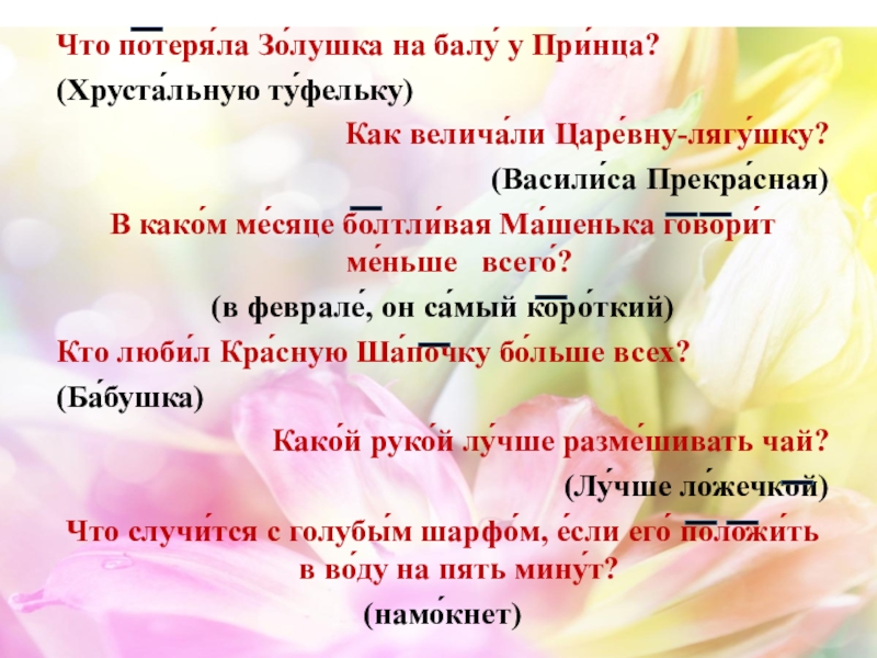 Что потеря́ла Зо́лушка на балу́ у При́нца?(Хруста́льную ту́фельку)Как велича́ли Царе́вну-лягу́шку?(Васили́са Прекра́сная)В како́м ме́сяце болтли́вая Ма́шенька говори́т ме́ньше