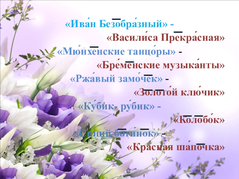«Ива́н Безобра́зный» - «Васили́са Прекра́сная»«Мю́нхенские танцо́ры» - «Бре́менские музыка́нты»«Ржа́вый замо́чек» - «Золото́й клю́чик»«Ку́бик- ру́бик» - «Колобо́к»«Си́ний боти́нок»