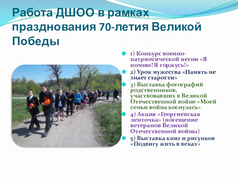 Слайд 11Работа ДШОО в рамках празднования 70-летия Великой Победы