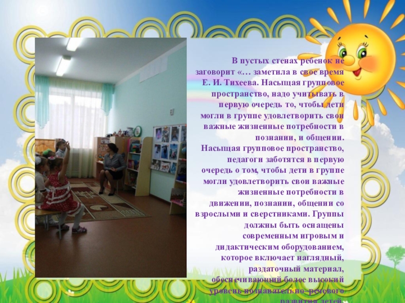 Е. И. Тихеева. Насыщая групповое пространство, надо учитывать в первую очередь то, чтобы дети могли в группе удовлетворить свои важные жизненные потребности в познании, и общении.