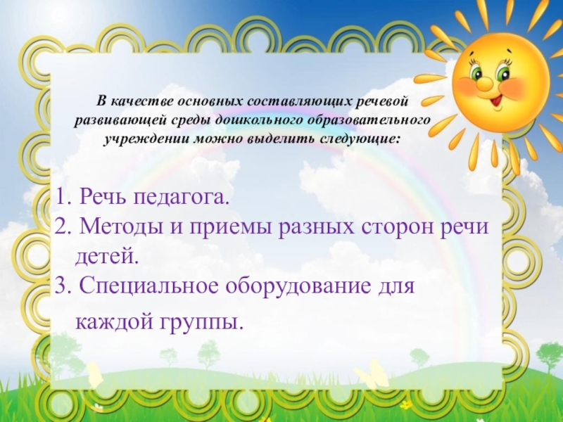 В качестве основных составляющих речевой развивающей среды дошкольного образовательного учреждении можно