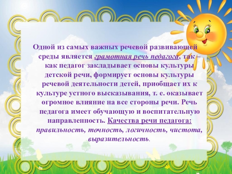 Одной из самых важных речевой развивающей среды является грамотная речь педагога,