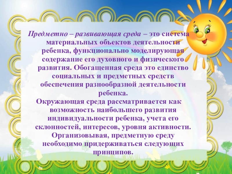 Окружающая среда рассматривается как возможность наибольшего развития индивидуальности ребенка, учета его склонностей, интересов, уровня активности. Организовывая, предметную среду необходимо придерживаться следующих принципов.