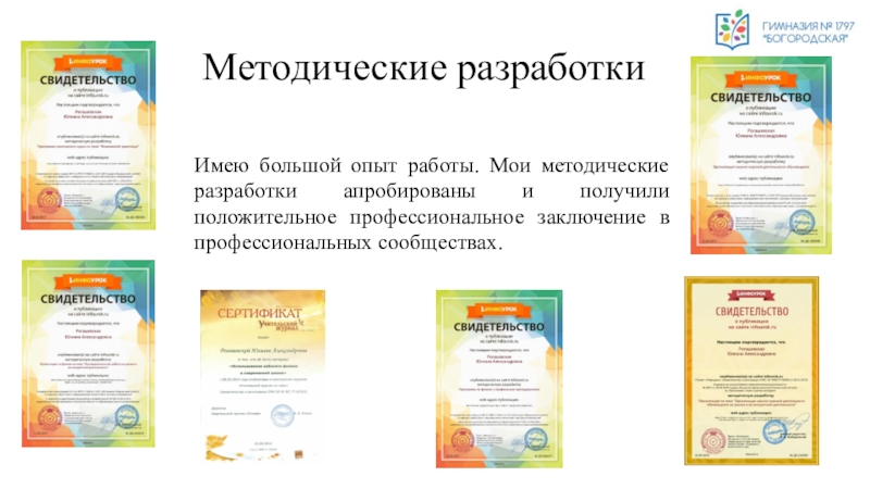 Имею большой опыт работы. Мои методические разработки апробированы и получили