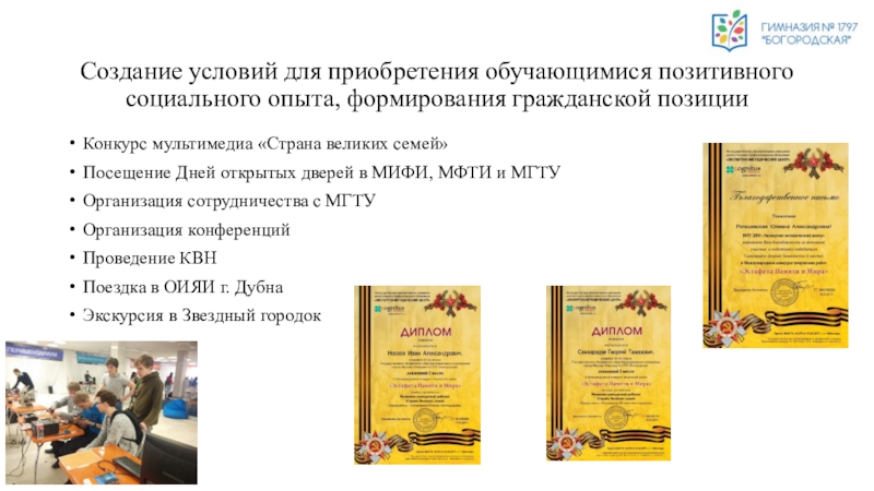 Слайд 15Создание условий для приобретения обучающимися позитивного социального опыта, формирования гражданской позиции