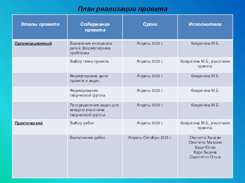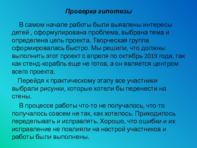 детей , сформулирована проблема, выбрана тема и определена цель проекта. Творческая группа сформировалась быстро. Мы решили, что должны выполнить этот проект с апреля по октябрь 2019 года, так как стенд-корабль еще не готов, а он является центром всего проекта.