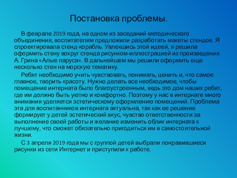 Ребят необходимо учить чувствовать, понимать, ценить и, что самое главное, творить красоту. Нужно делать все необходимое, чтобы помещение интерната было благоустроенным, ведь это дом наших ребят, где им должно быть уютно и комфортно. Поэтому у нас в интернате много внимания уделяется эстетическому оформлению помещений. Проблема эта для воспитанников интерната актуальна, так как ее решение формирует у детей эстетический вкус, чувство ответственности за выполнение своей работы и желание изменить облик интерната к лучшему, что сможет обязательно пригодиться им в самостоятельной жизни.