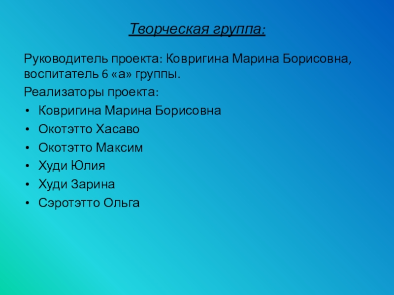 Руководитель проекта: Ковригина Марина Борисовна, воспитатель 6 «а» группы.