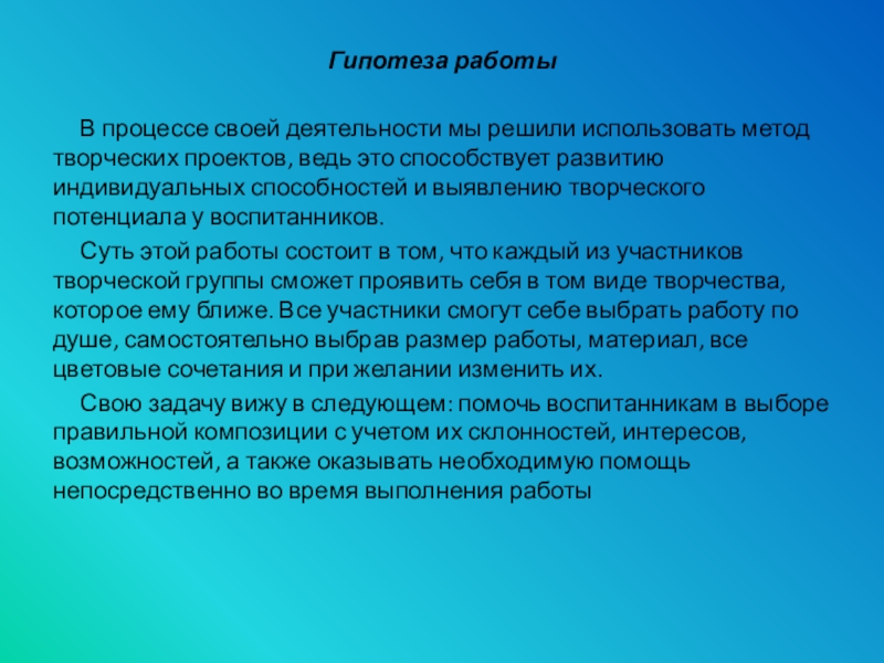 Свою задачу вижу в следующем: помочь воспитанникам в выборе правильной композиции с учетом их склонностей, интересов, возможностей, а также оказывать необходимую помощь непосредственно во время выполнения работы