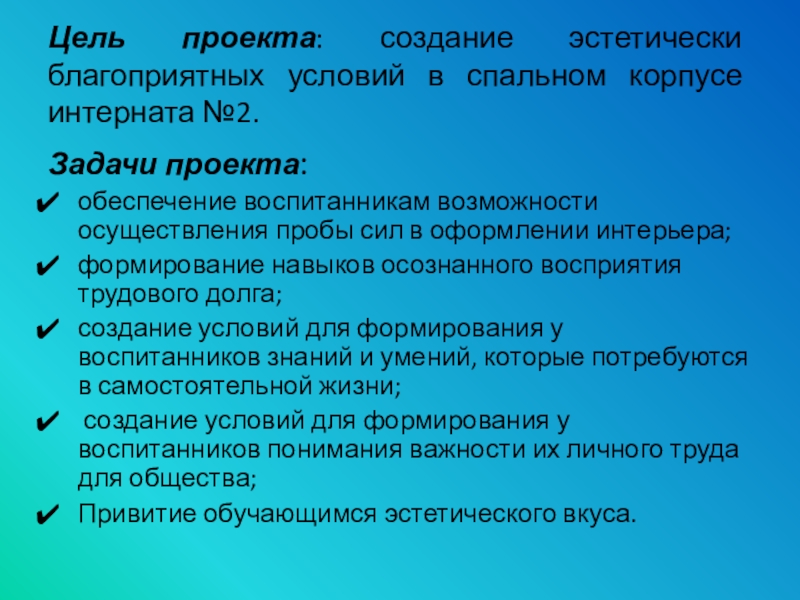 Слайд 5Цель проекта: создание эстетически благоприятных условий в спальном корпусе интерната №2.