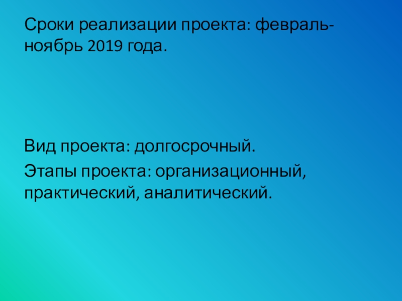 Слайд 3Сроки реализации проекта: февраль-ноябрь 2019 года.