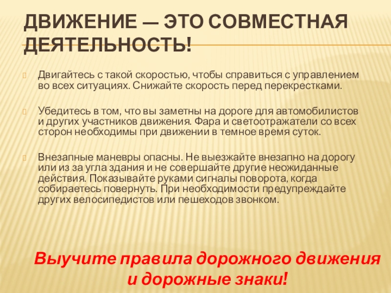 Внезапные маневры опасны. Не выезжайте внезапно на дорогу или из за угла здания и не совершайте другие неожиданные действия. Показывайте руками сигналы поворота, когда собираетесь повернуть. При необходимости предупреждайте других велосипедистов или пешеходов звонком.