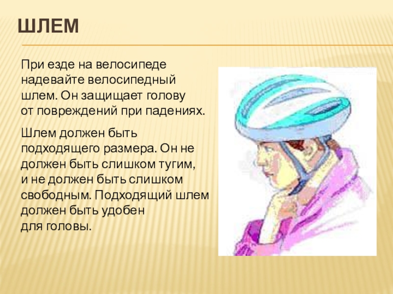 При езде на велосипеде надевайте велосипедный шлем. Он защищает голову от повреждений при падениях.