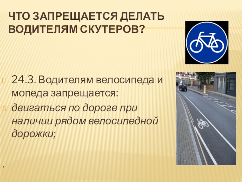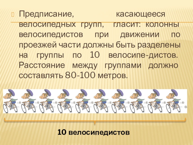 Слайд 20Предписание, касающееся велосипедных групп, гласит: колонны велосипедистов при движении по проезжей