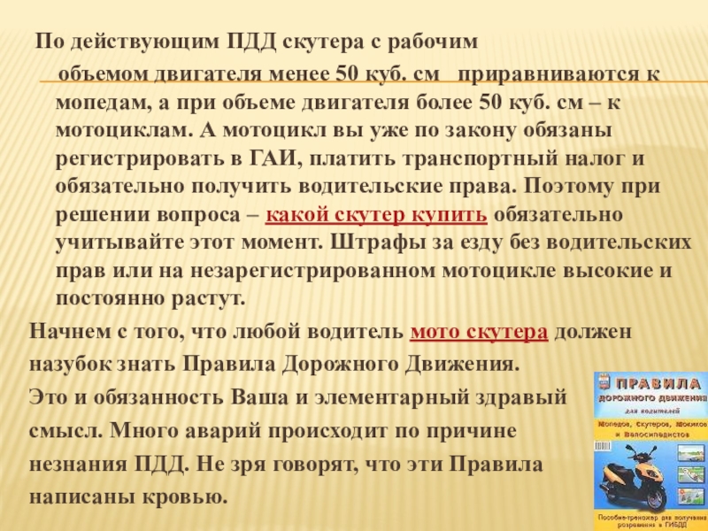 объемом двигателя менее 50 куб. см приравниваются к мопедам, а при объеме двигателя более 50 куб. см – к мотоциклам. А мотоцикл вы уже по закону обязаны регистрировать в ГАИ, платить транспортный налог и обязательно получить водительские права. Поэтому при решении вопроса – какой скутер купить обязательно учитывайте этот момент. Штрафы за езду без водительских прав или на незарегистрированном мотоцикле высокие и постоянно растут.