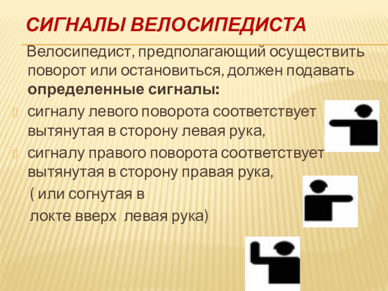 Велосипедист, предполагающий осуществить поворот или остановиться, должен подавать