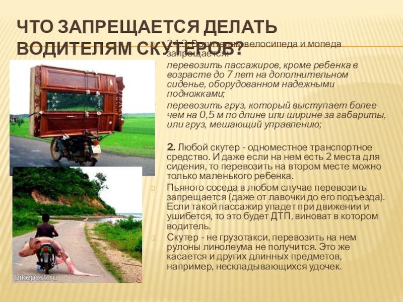 2. Любой скутер - одноместное транспортное средство. И даже если на нем есть 2 места для сидения, то перевозить на втором месте можно только маленького ребенка.