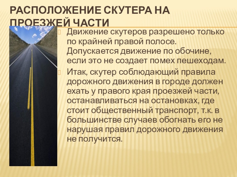Итак, скутер соблюдающий правила дорожного движения в городе должен ехать у правого края проезжей части, останавливаться на остановках, где стоит общественный транспорт, т.к. в большинстве случаев обогнать его не нарушая правил дорожного движения не получится.