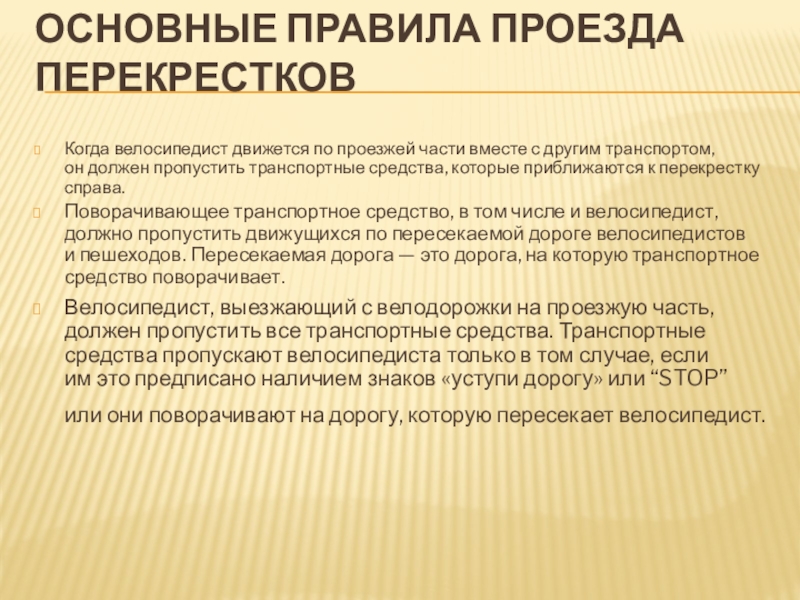 Велосипедист, выезжающий с велодорожки на проезжую часть, должен пропустить все транспортные средства. Транспортные средства пропускают велосипедиста только в том случае, если им это предписано наличием знаков «уступи дорогу» или “STOP” или они поворачивают на дорогу, которую пересекает велосипедист.