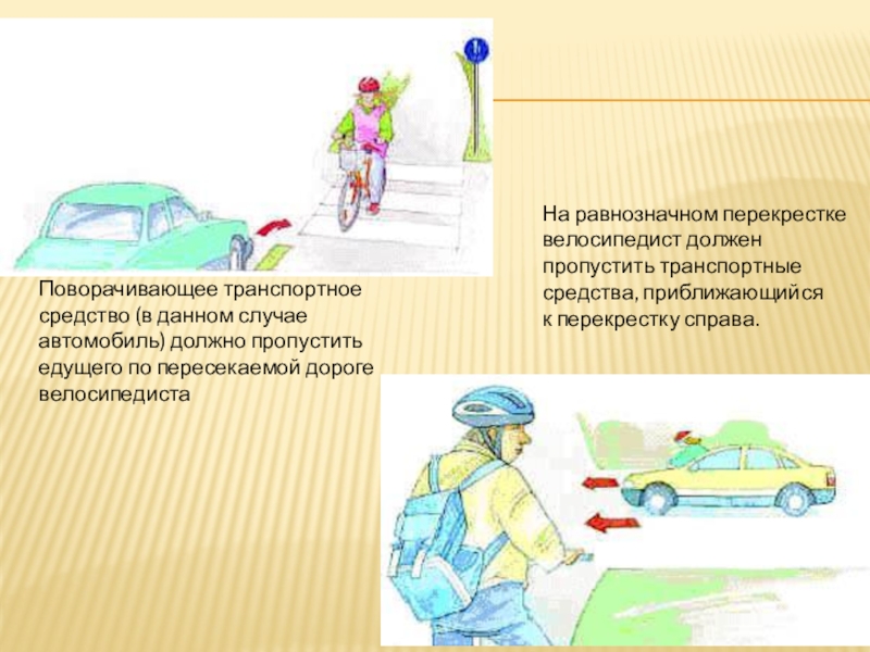 Слайд 18Велосипедист движущийся в направлении действия знака должен пропустить транспортные средства и слева и справа.