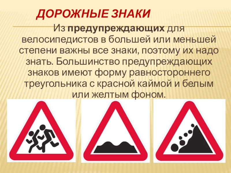 степени важны все знаки, поэтому их надо знать. Большинство предупреждающих знаков имеют форму равностороннего треугольника с красной каймой и белым или желтым фоном.