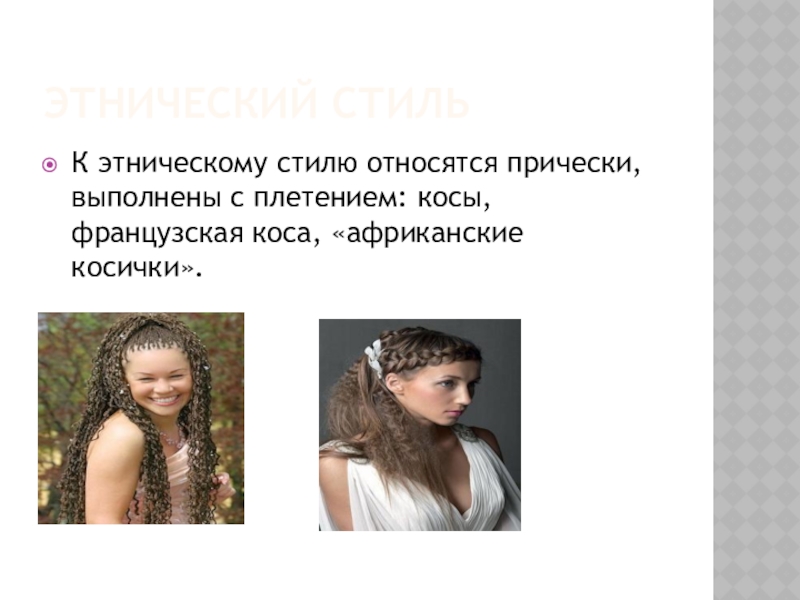 Этнический стильК этническому стилю относятся прически, выполнены с плетением: косы, французская коса, «африканские косички».