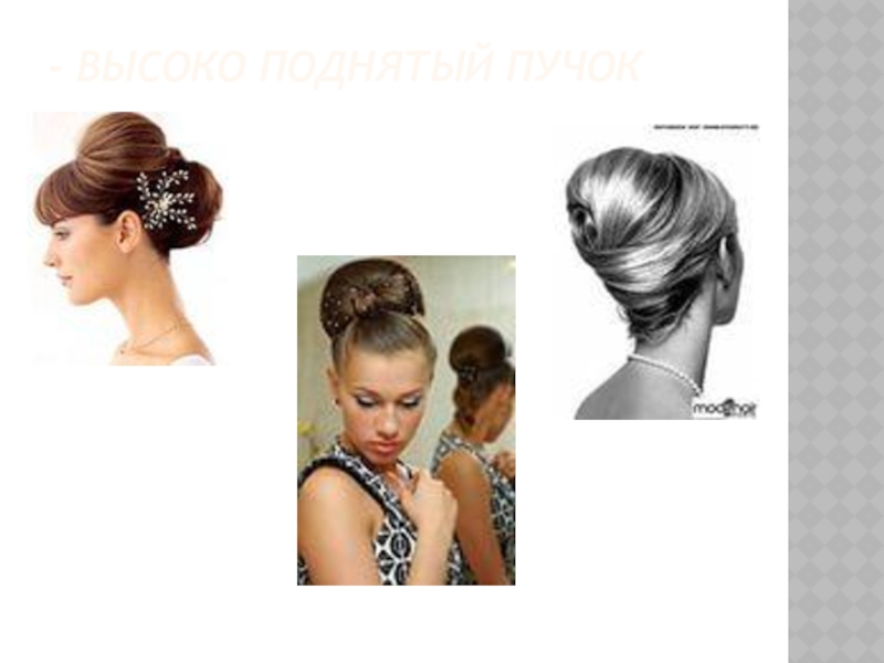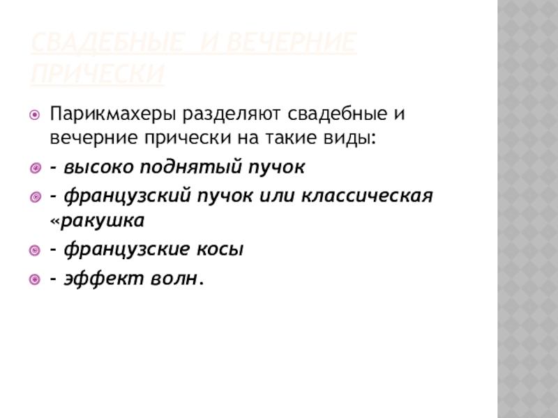 Свадебные  и вечерние прическиПарикмахеры разделяют свадебные и вечерние прически на такие виды:- высоко поднятый пучок- французский пучок