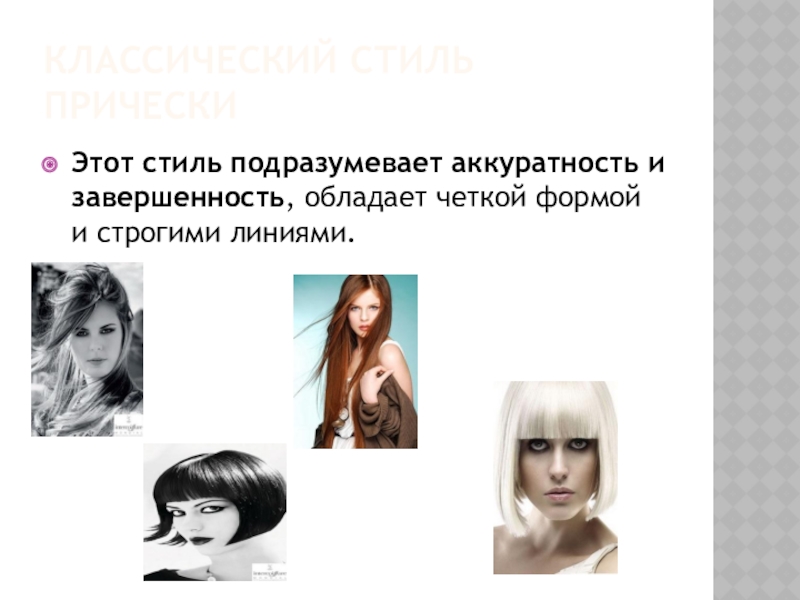 Классический стиль прическиЭтот стиль подразумевает аккуратность и завершенность, обладает четкой формой и строгими линиями.