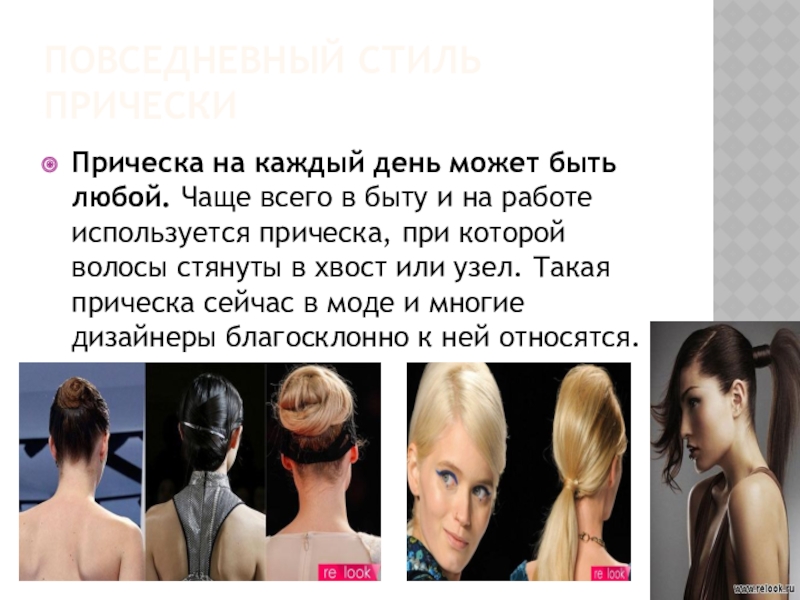 быту и на работе используется прическа, при которой волосы стянуты в хвост или узел. Такая прическа сейчас в моде и многие дизайнеры благосклонно к ней относятся.