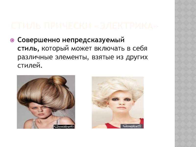 Стиль прически «Электрика»Совершенно непредсказуемый стиль, который может включать в себя различные элементы, взятые из других стилей.
