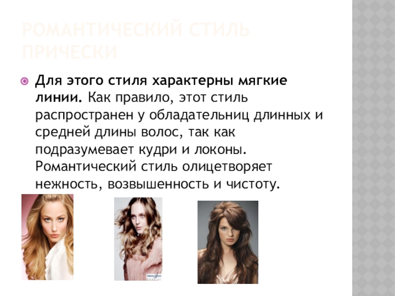 Романтический стиль прическиДля этого стиля характерны мягкие линии. Как правило, этот стиль распространен у обладательниц длинных и средней