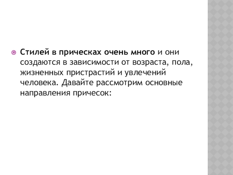 Слайд 2Стилей в прическах очень много и они создаются в зависимости от возраста,