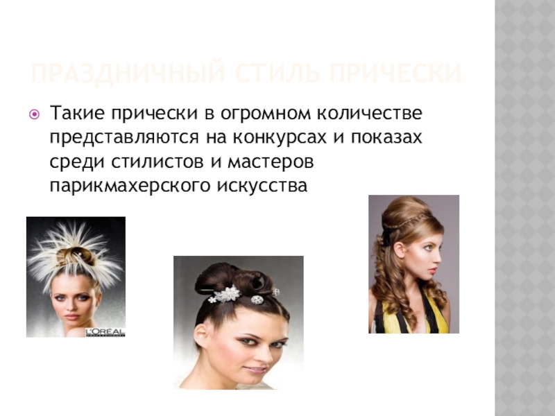 Праздничный стиль прическиТакие прически в огромном количестве представляются на конкурсах и показах среди стилистов и мастеров парикмахерского